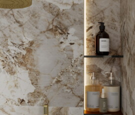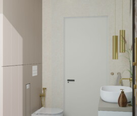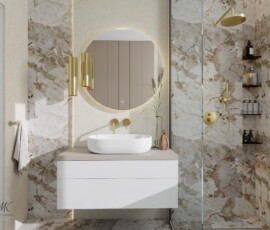 Ta łazienka to połączenie stylu i praktycznych rozwiązań. Ciepłe odcienie beżu, marmur i złote akcenty tworzą harmonijną, elegancką przestrzeń, w której każdy detal ma znaczenie.