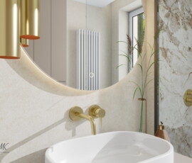 Elegancja spotyka funkcjonalność w przytulnej łazience pełnej ciepłych beży i marmurowych detali. Złote baterie i subtelne akcenty podkreślają styl, a duże lustro i naturalne światło optycznie powiększają przestrzeń. Przemyślana zabudowa zapewnia wygodne miejsce do przechowywania, a prysznic typu walk-in dodaje nowoczesności i komfortu. Ciekawe oświetlenie wprowadza nastrój i podkreśla charakter wnętrza, sprawiając, że łazienka jest nie tylko praktyczna, ale też wyjątkowa.