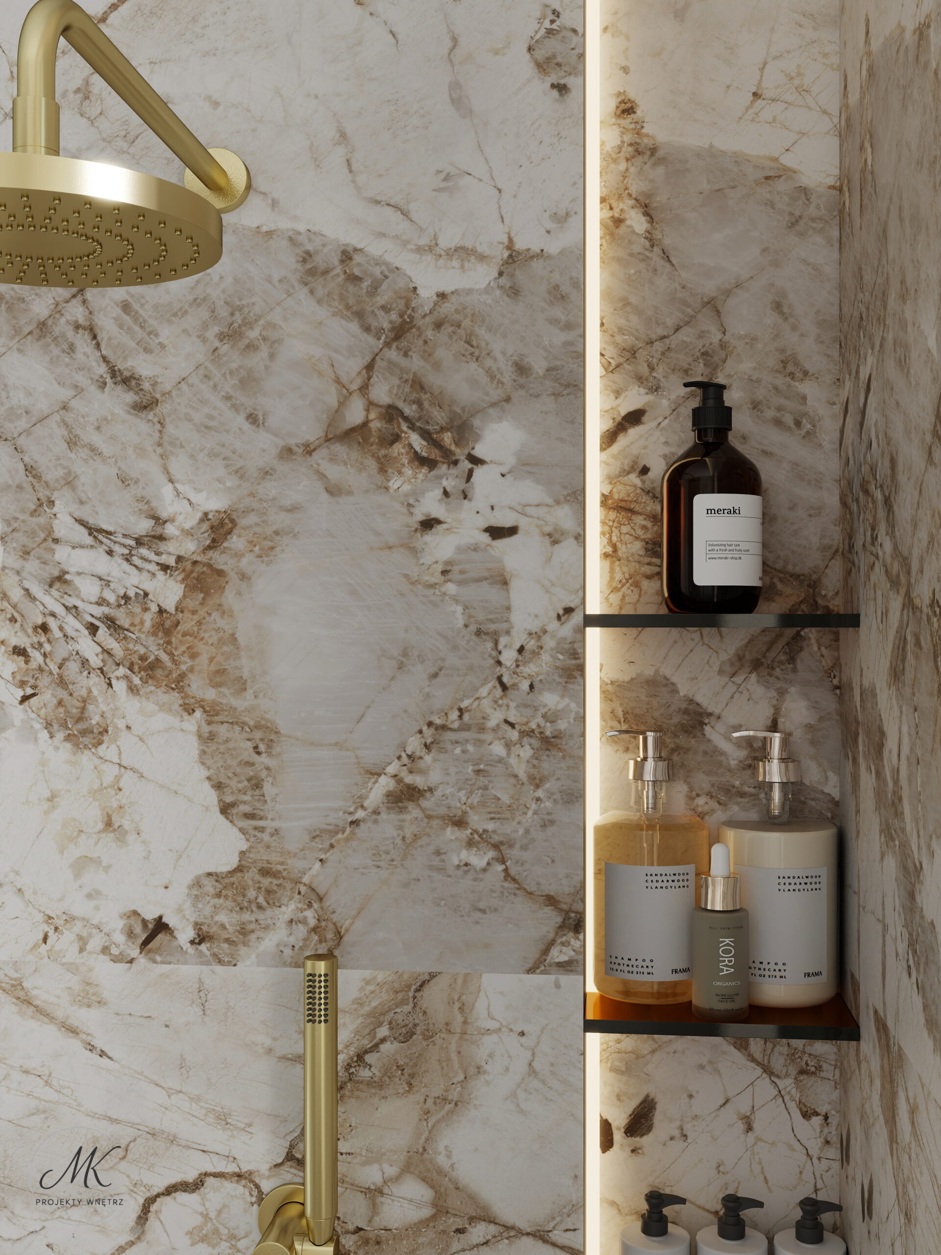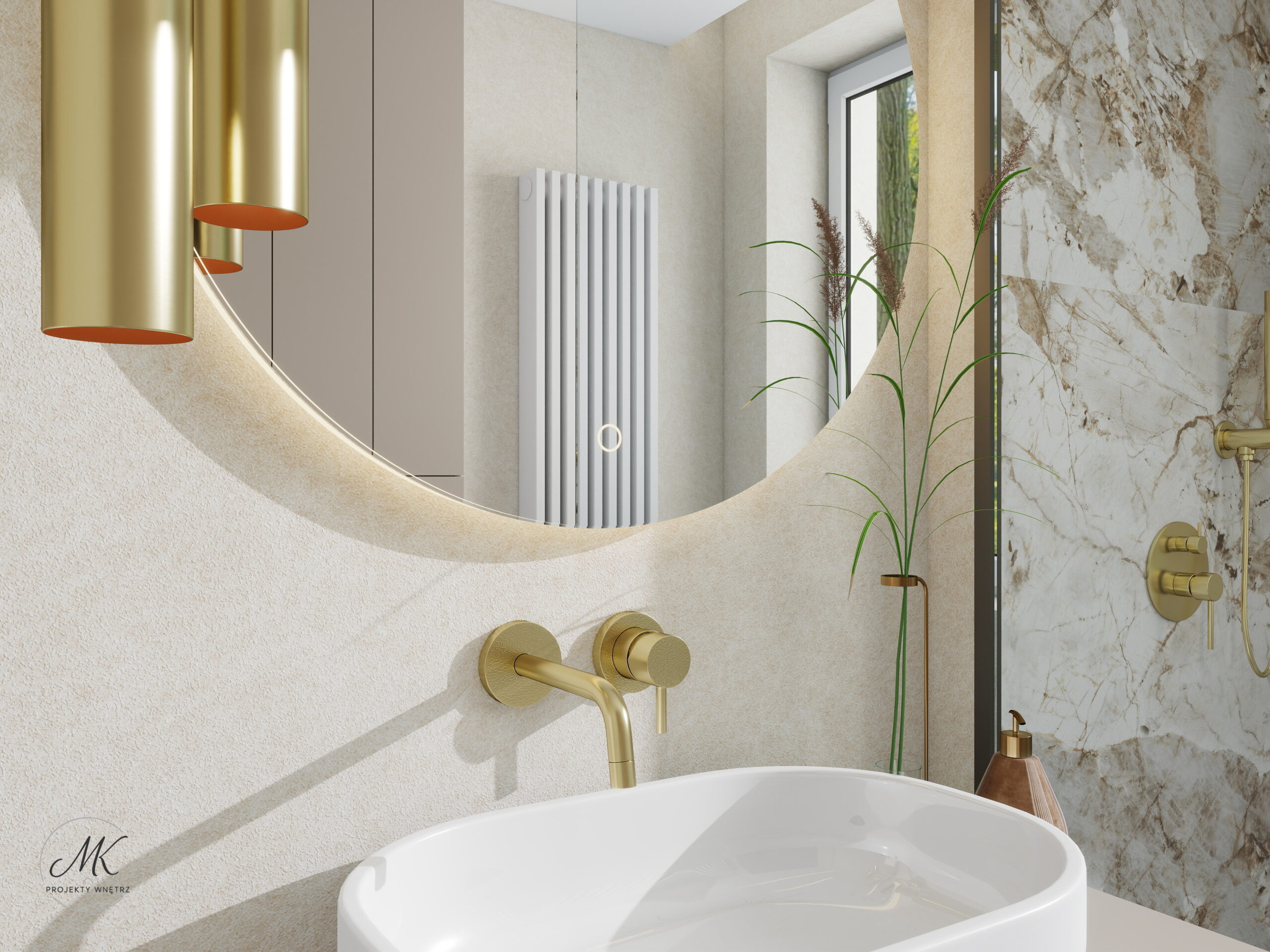 Elegancja spotyka funkcjonalność w przytulnej łazience pełnej ciepłych beży i marmurowych detali. Złote baterie i subtelne akcenty podkreślają styl, a duże lustro i naturalne światło optycznie powiększają przestrzeń. Przemyślana zabudowa zapewnia wygodne miejsce do przechowywania, a prysznic typu walk-in dodaje nowoczesności i komfortu. Ciekawe oświetlenie wprowadza nastrój i podkreśla charakter wnętrza, sprawiając, że łazienka jest nie tylko praktyczna, ale też wyjątkowa.