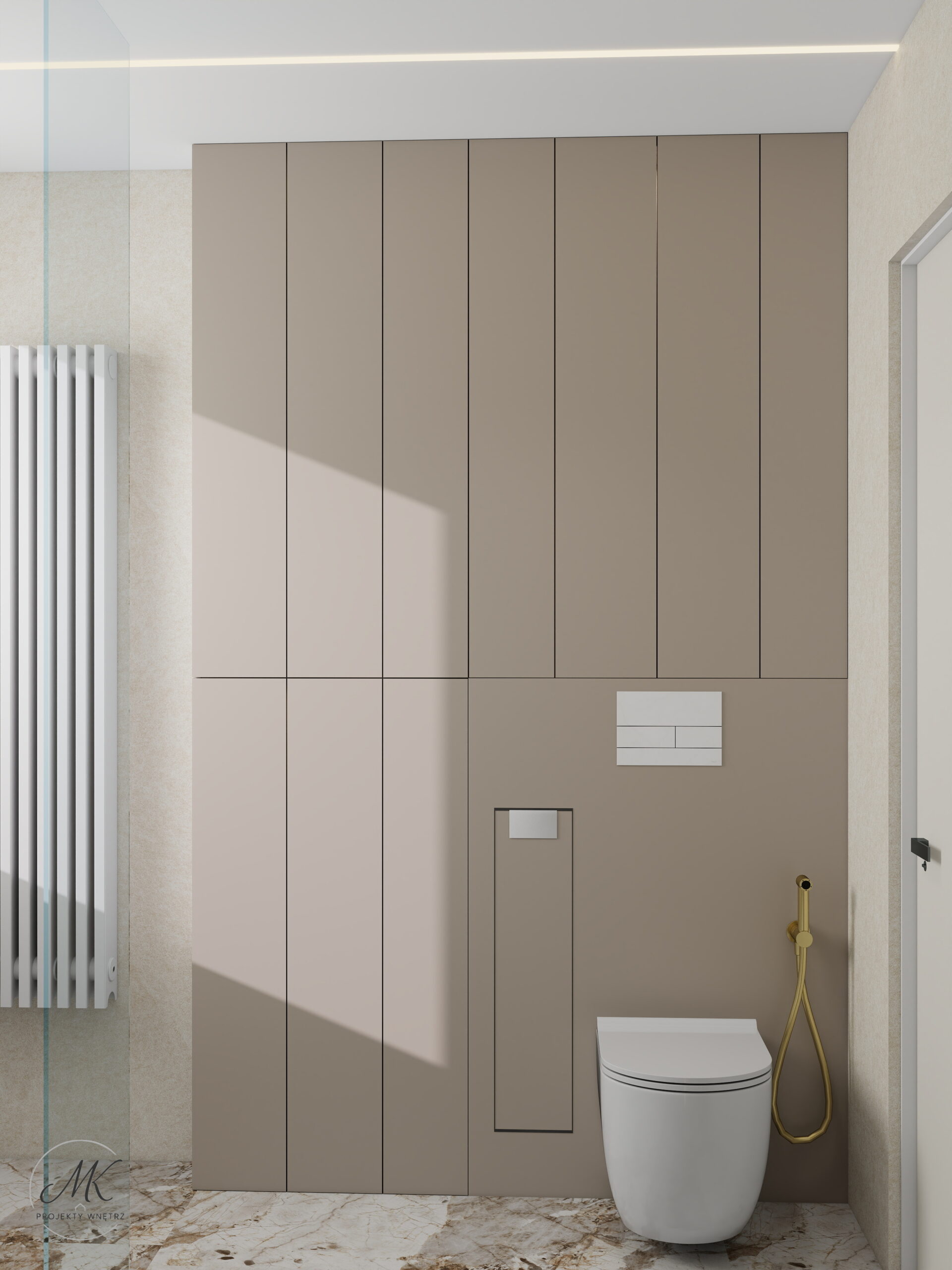 Ta łazienka to połączenie stylu i praktycznych rozwiązań. Ciepłe odcienie beżu, marmur i złote akcenty tworzą harmonijną, elegancką przestrzeń, w której każdy detal ma znaczenie.