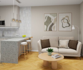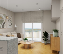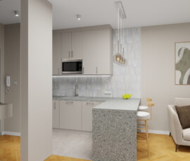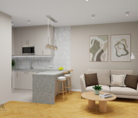 Jasna kolorystyka oparta na ciepłych beżach, delikatnych szarościach i naturalnym drewnie optycznie powiększa wnętrze, tworząc spójne i harmonijne tło. Subtelne detale, takie jak geometryczna mozaika w łazience, roślinna tapeta w sypialni czy granitowy blat w aneksie kuchennym, nadają wnętrzu charakter i indywidualny styl.