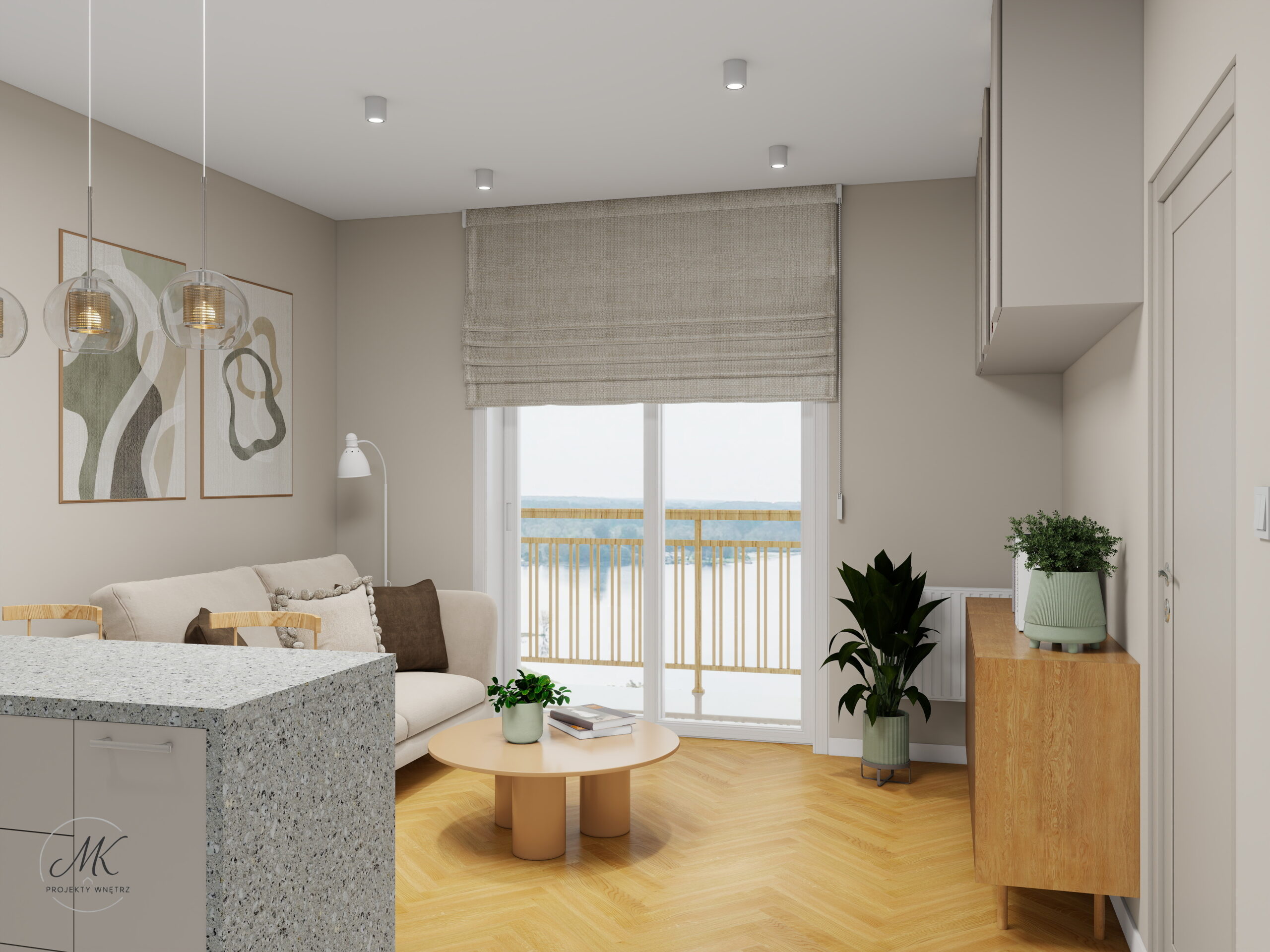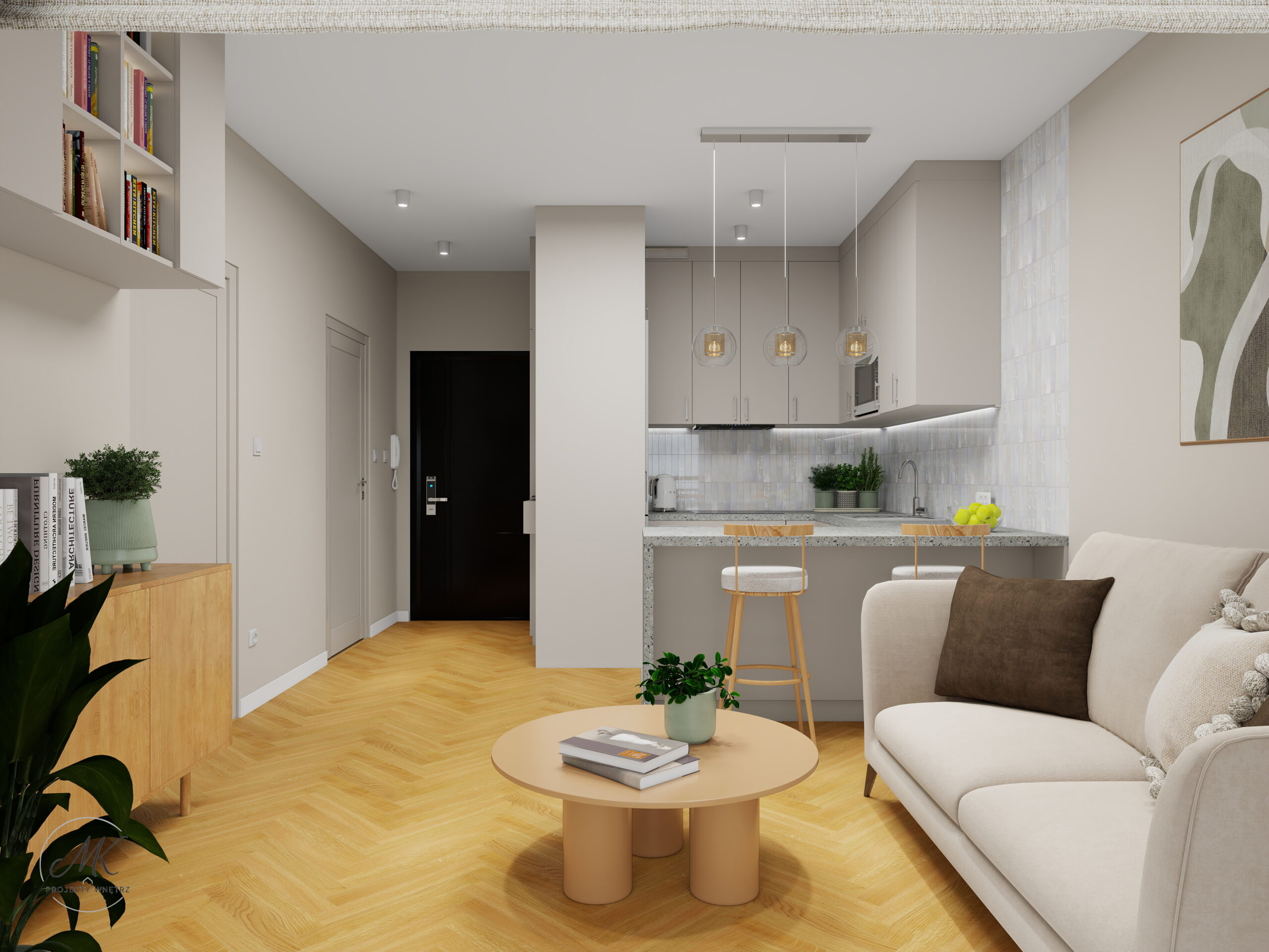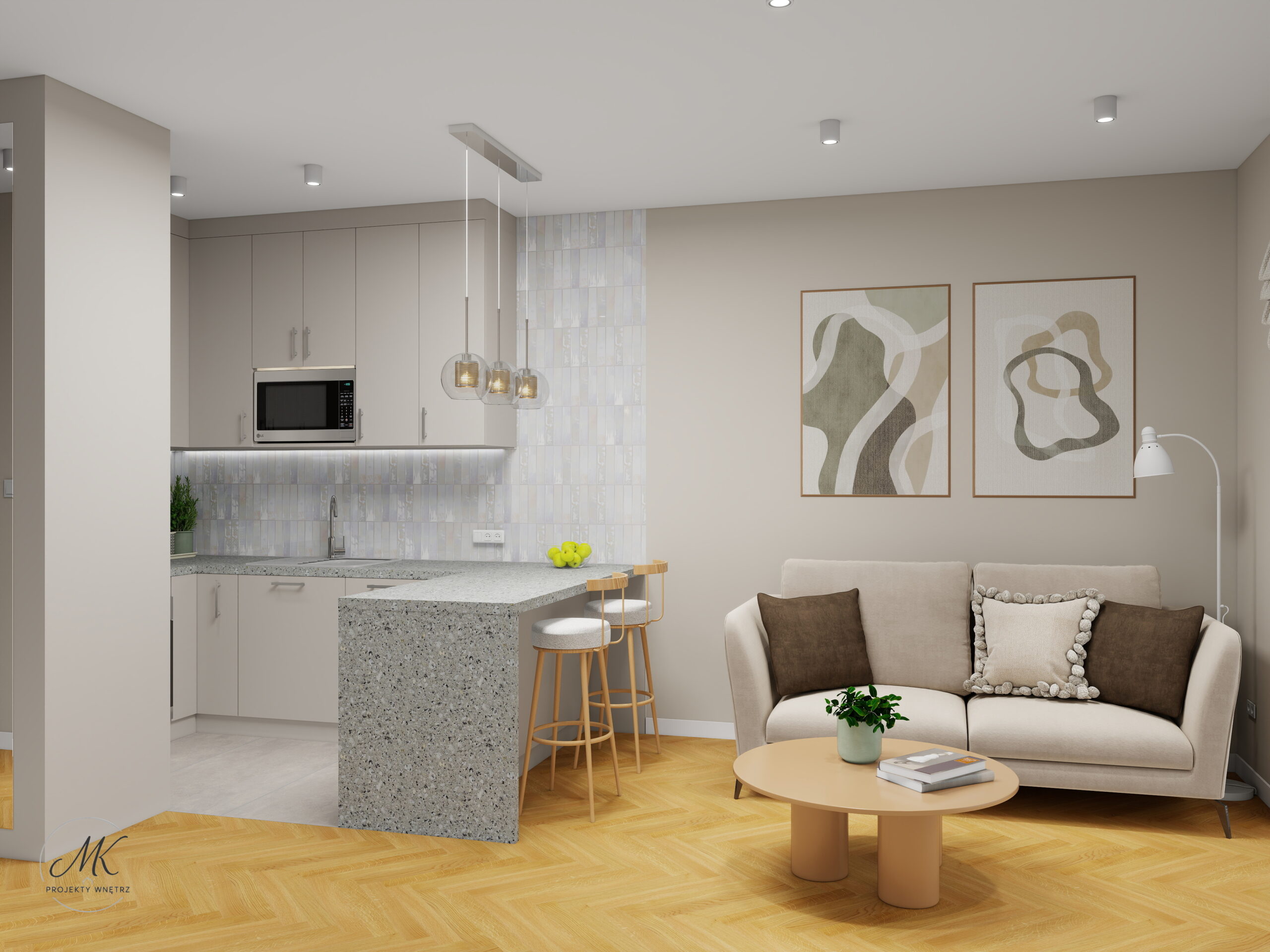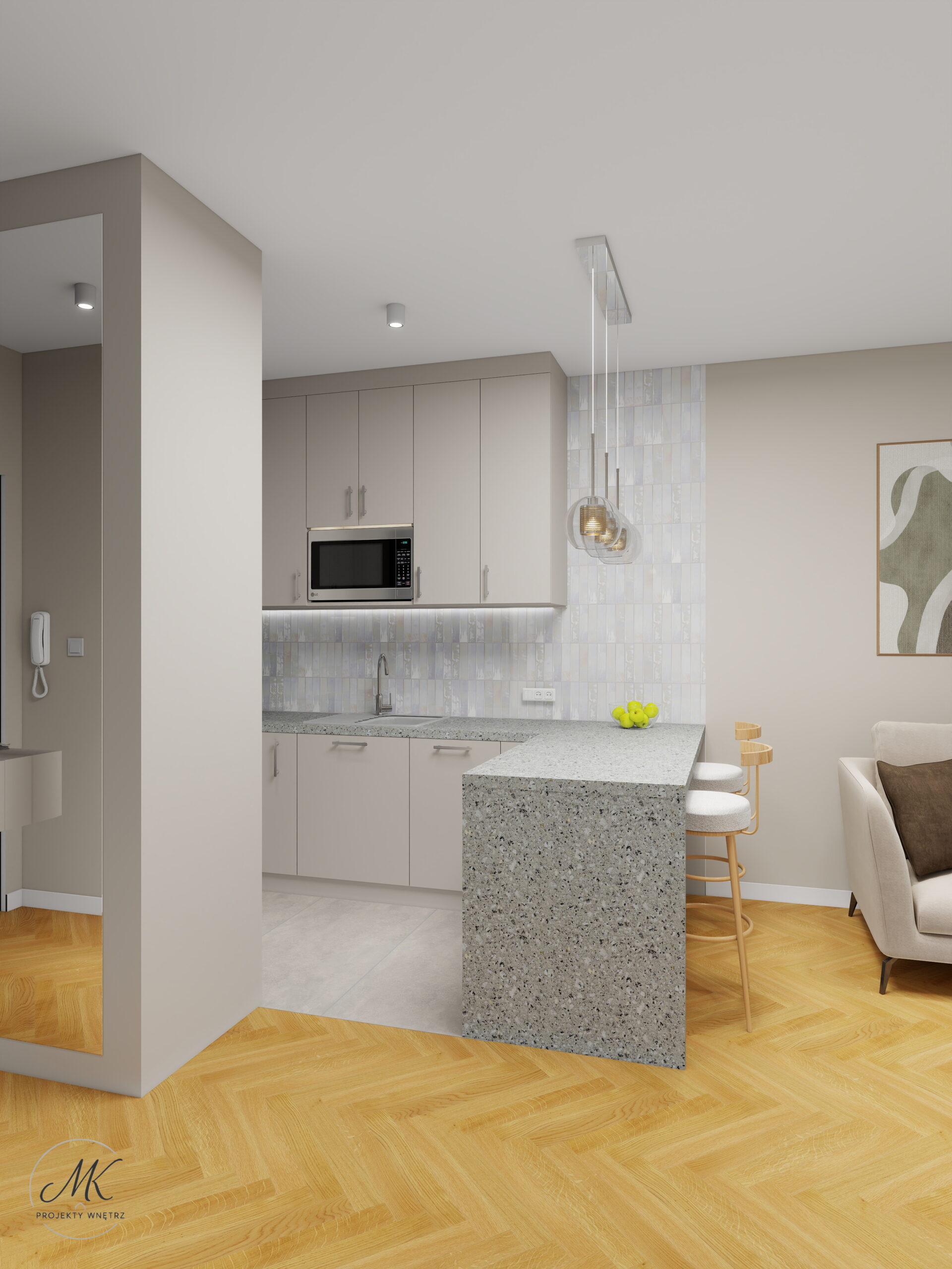 Jasna kolorystyka oparta na ciepłych beżach, delikatnych szarościach i naturalnym drewnie optycznie powiększa wnętrze, tworząc spójne i harmonijne tło. Subtelne detale, takie jak geometryczna mozaika w łazience, roślinna tapeta w sypialni czy granitowy blat w aneksie kuchennym, nadają wnętrzu charakter i indywidualny styl.