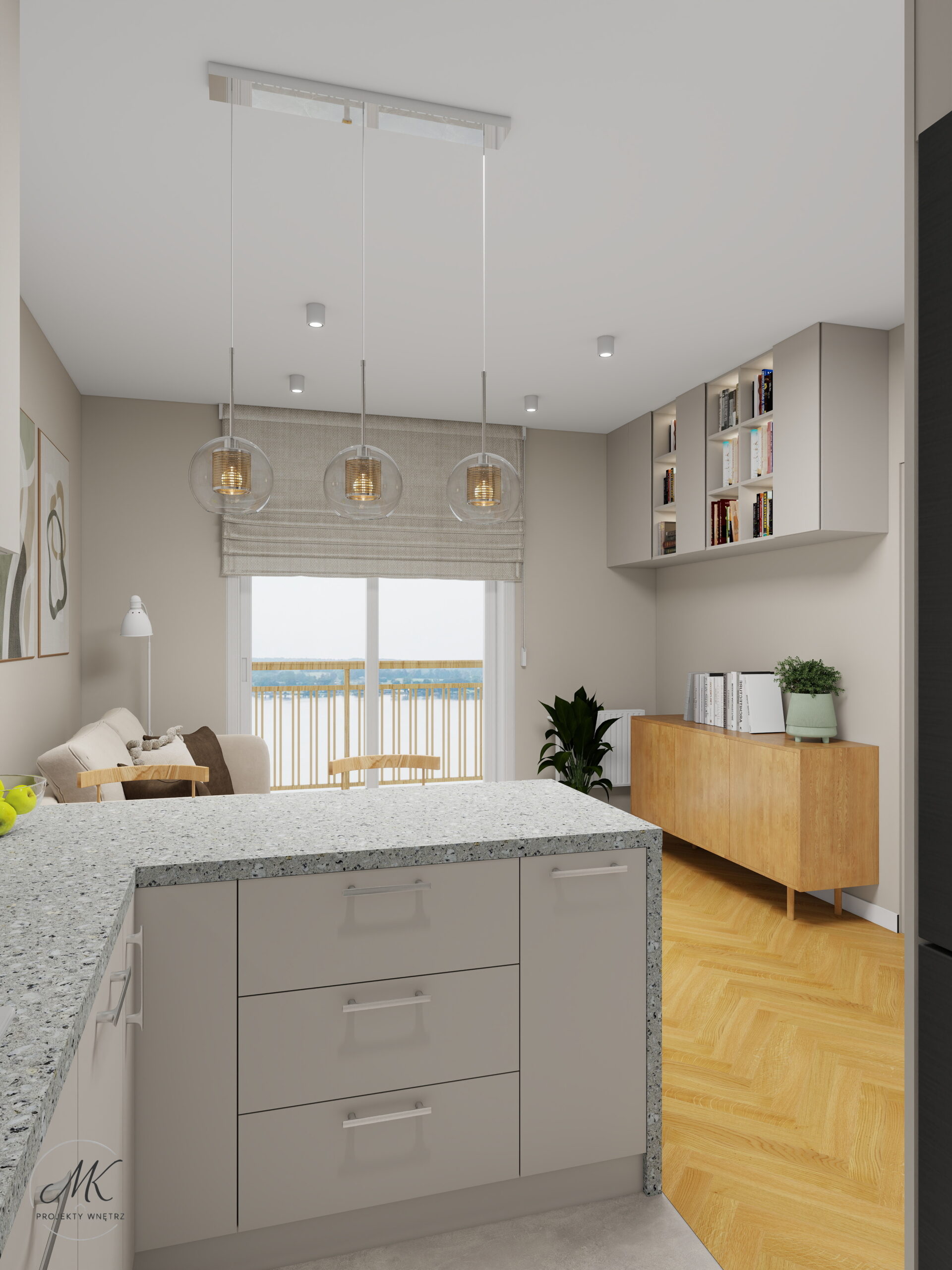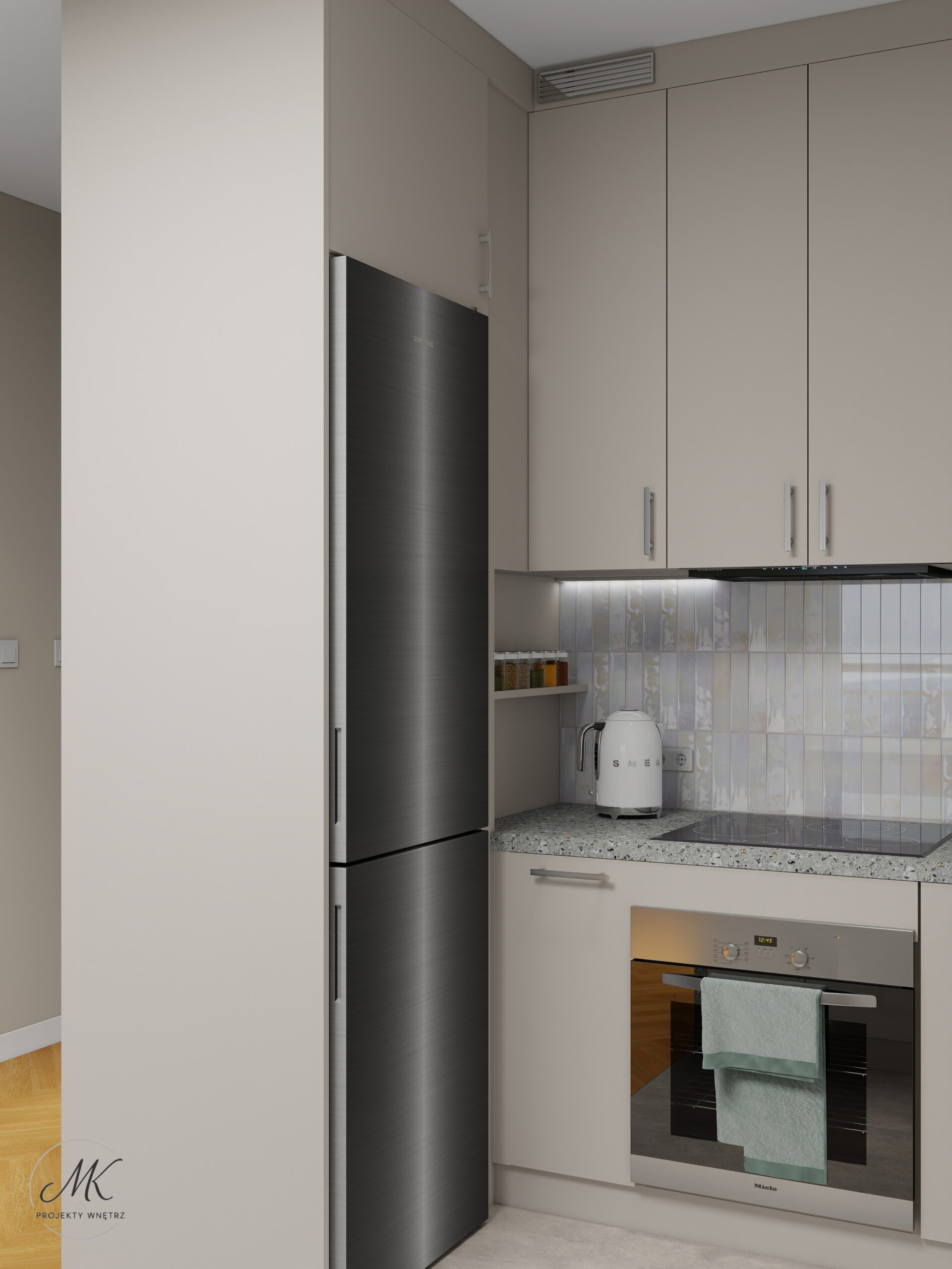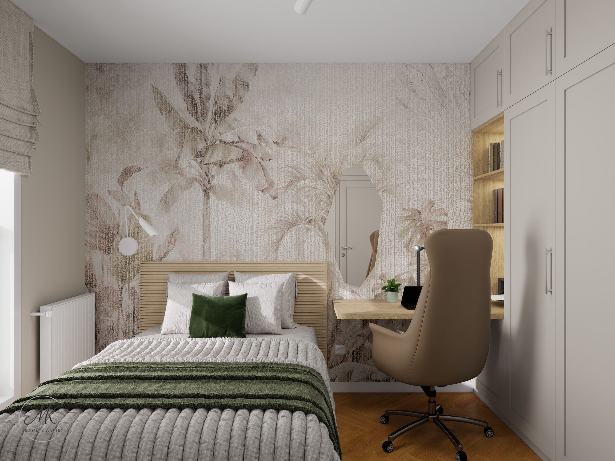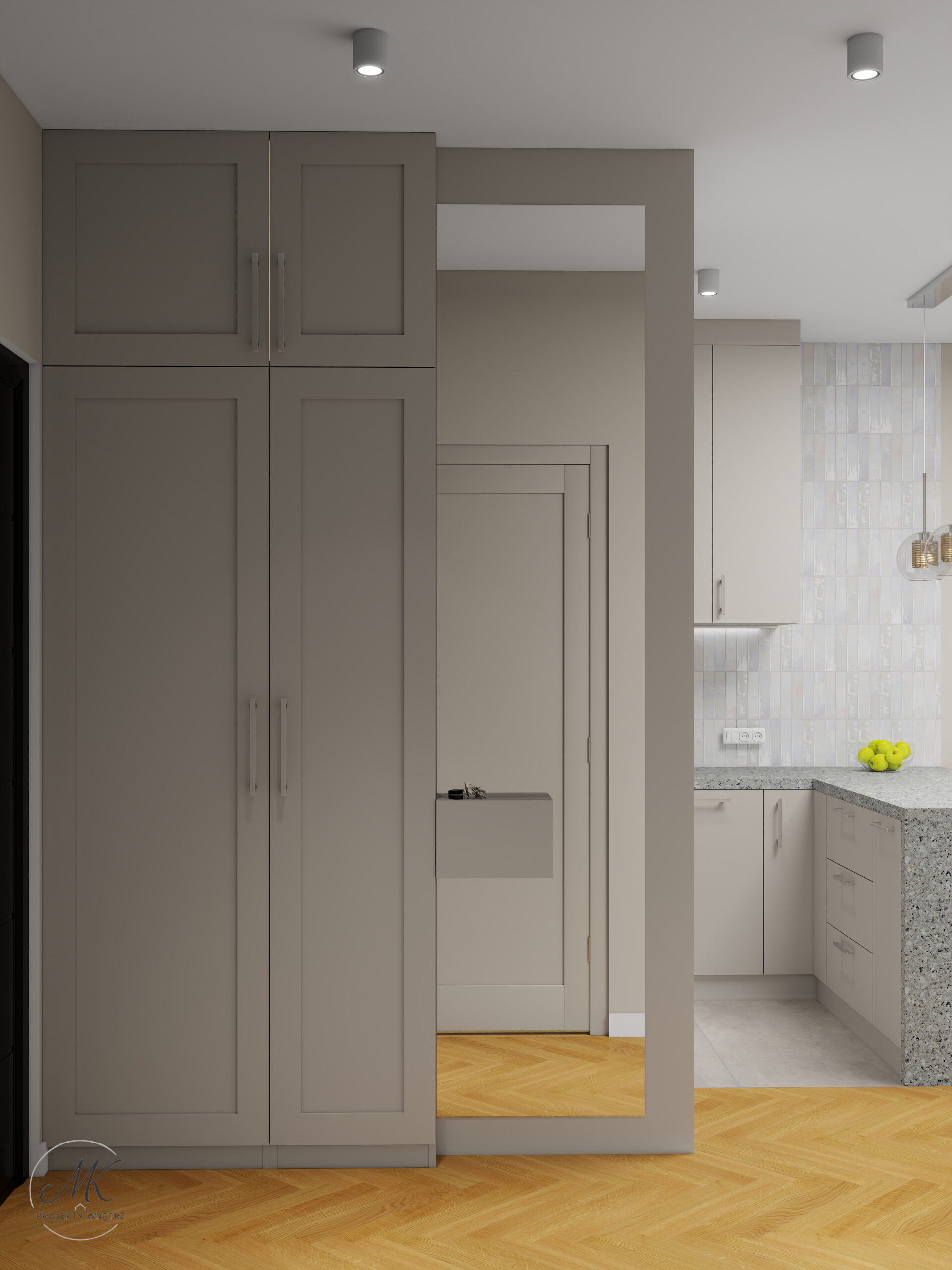 Jasna kolorystyka oparta na ciepłych beżach, delikatnych szarościach i naturalnym drewnie optycznie powiększa wnętrze, tworząc spójne i harmonijne tło. Subtelne detale, takie jak geometryczna mozaika w łazience, roślinna tapeta w sypialni czy granitowy blat w aneksie kuchennym, nadają wnętrzu charakter i indywidualny styl.