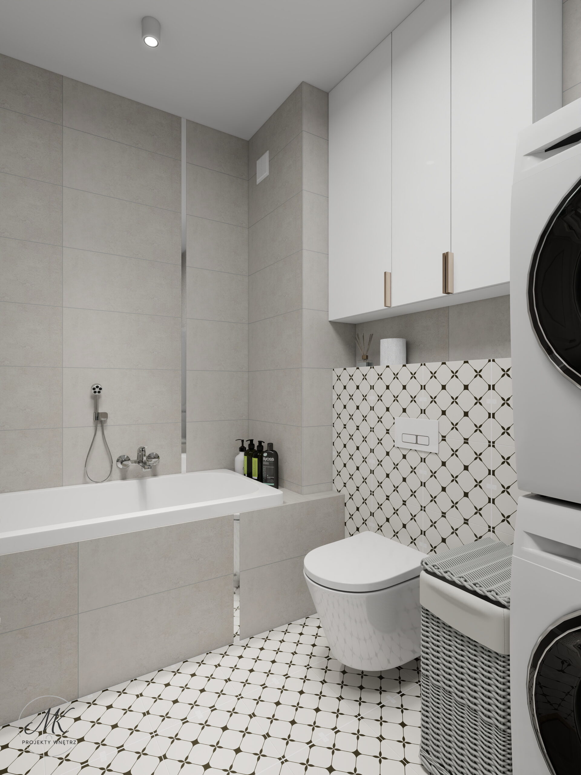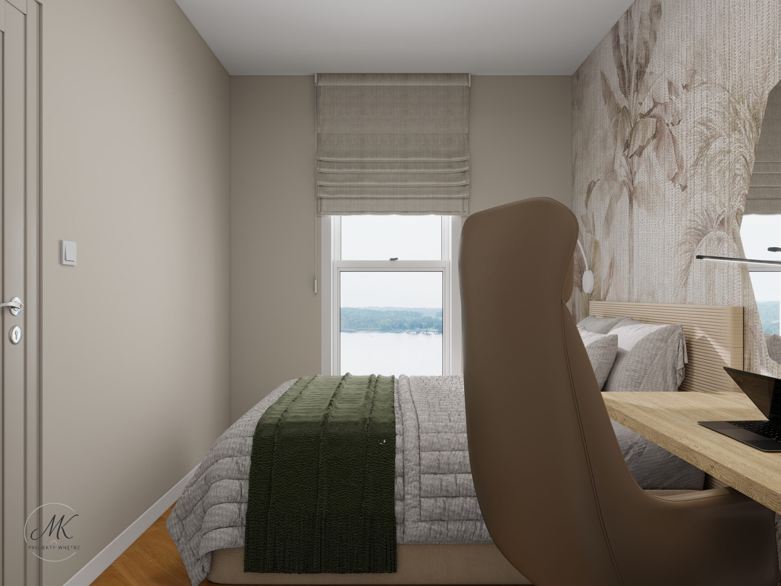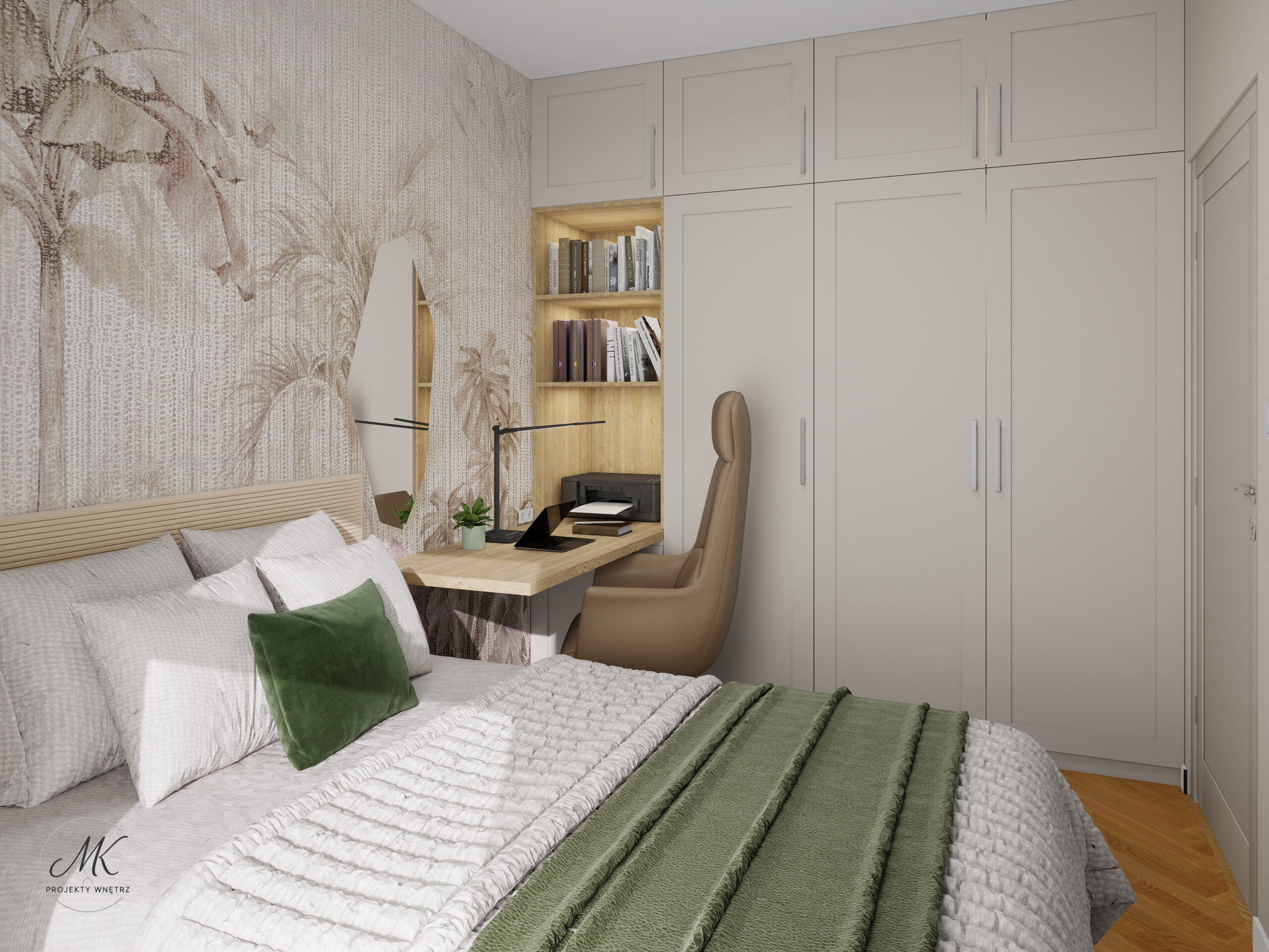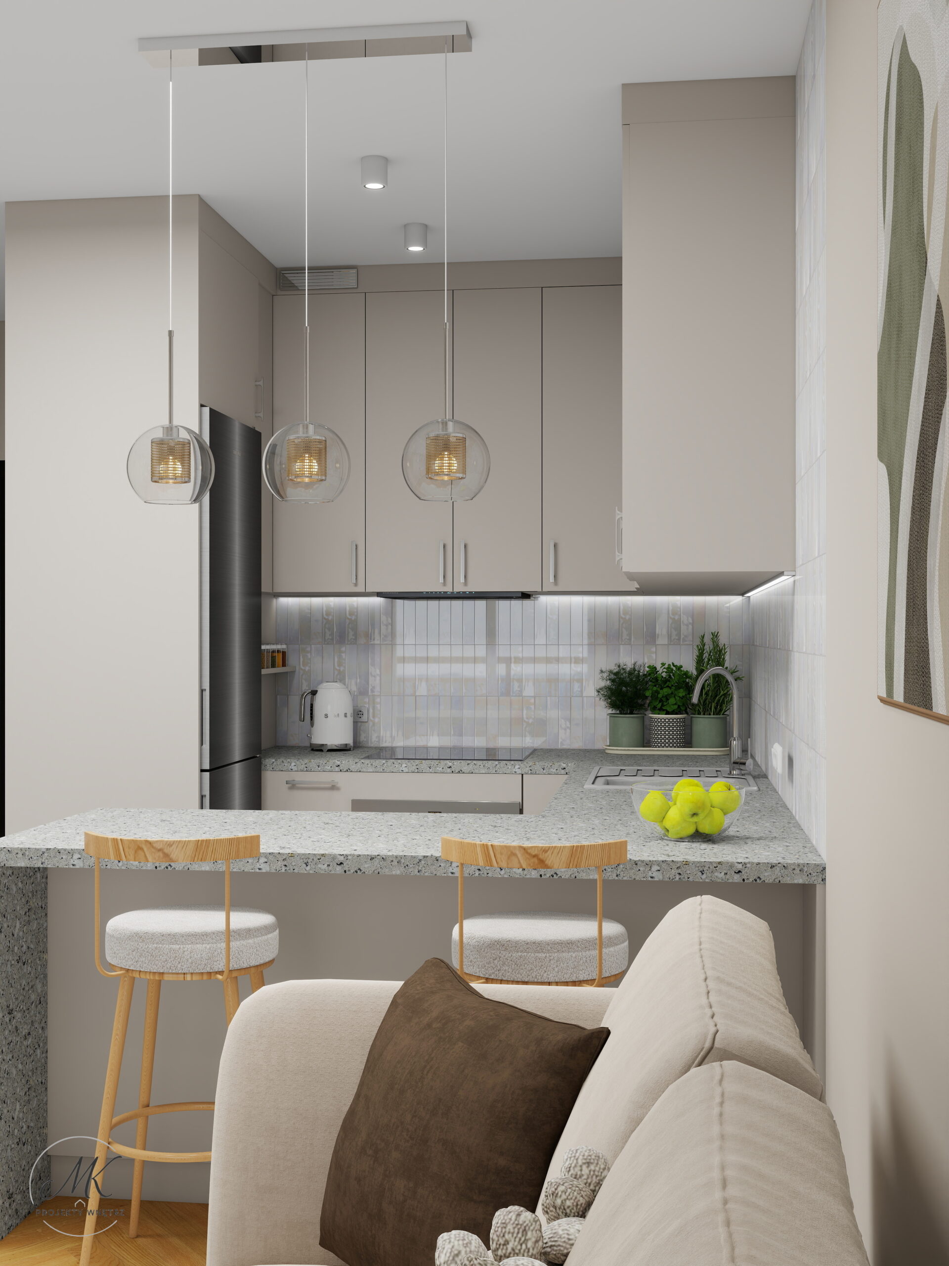 Jasna kolorystyka oparta na ciepłych beżach, delikatnych szarościach i naturalnym drewnie optycznie powiększa wnętrze, tworząc spójne i harmonijne tło. Subtelne detale, takie jak geometryczna mozaika w łazience, roślinna tapeta w sypialni czy granitowy blat w aneksie kuchennym, nadają wnętrzu charakter i indywidualny styl.