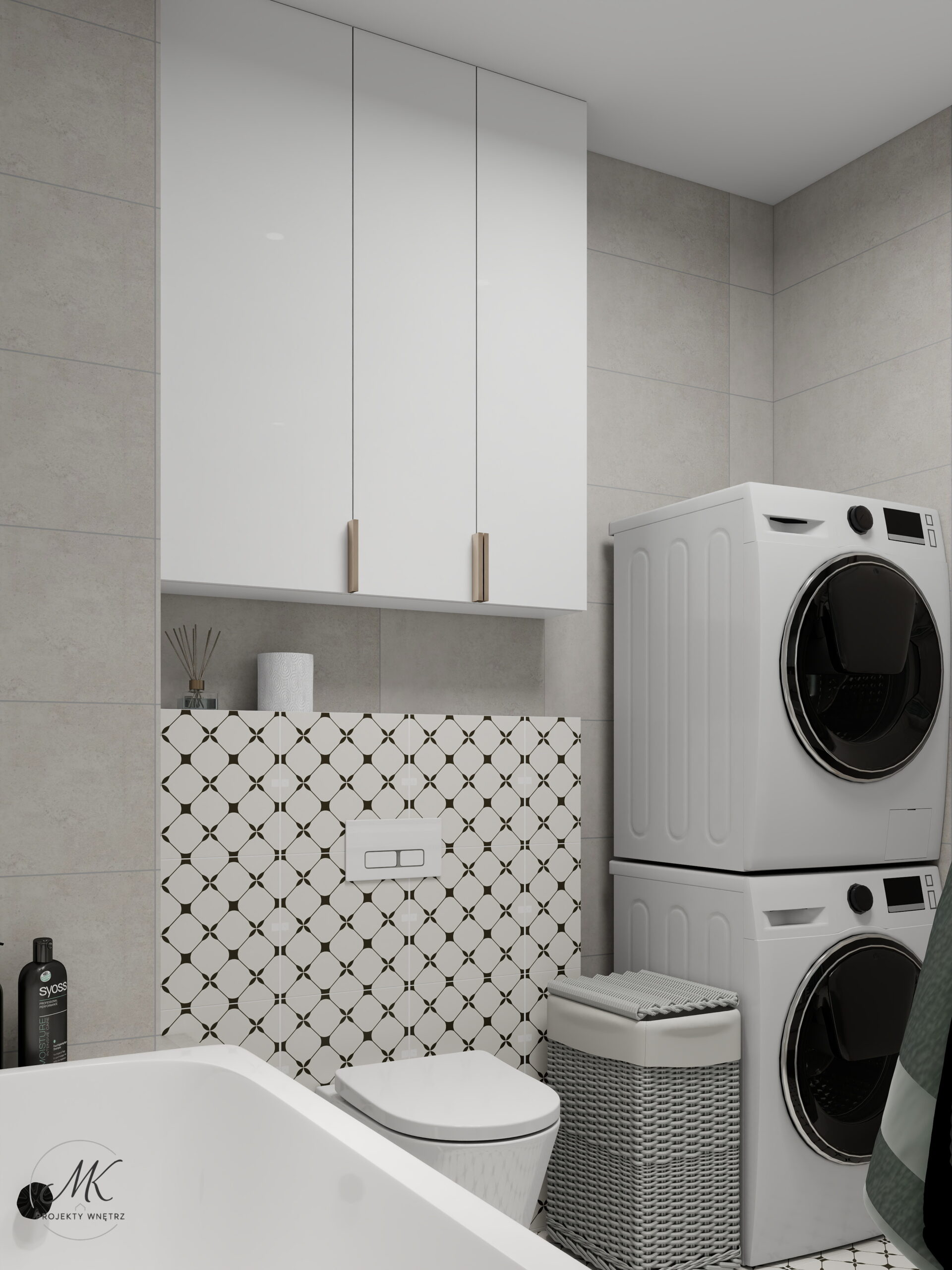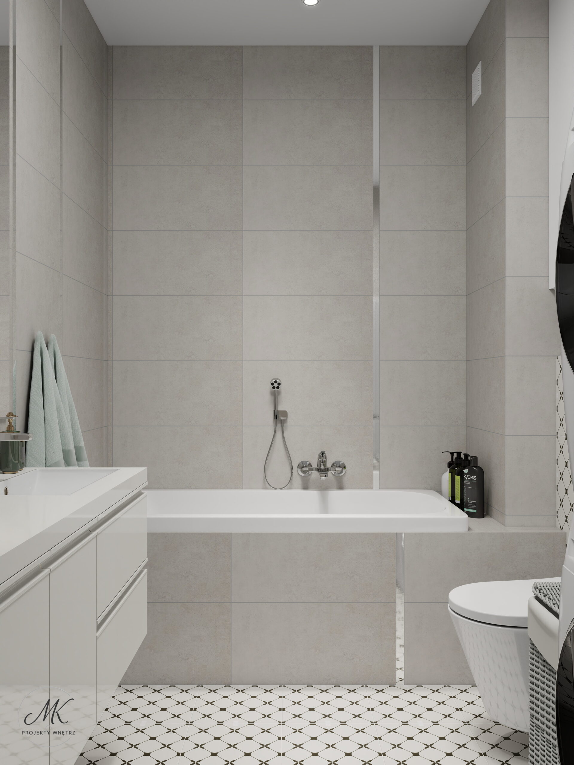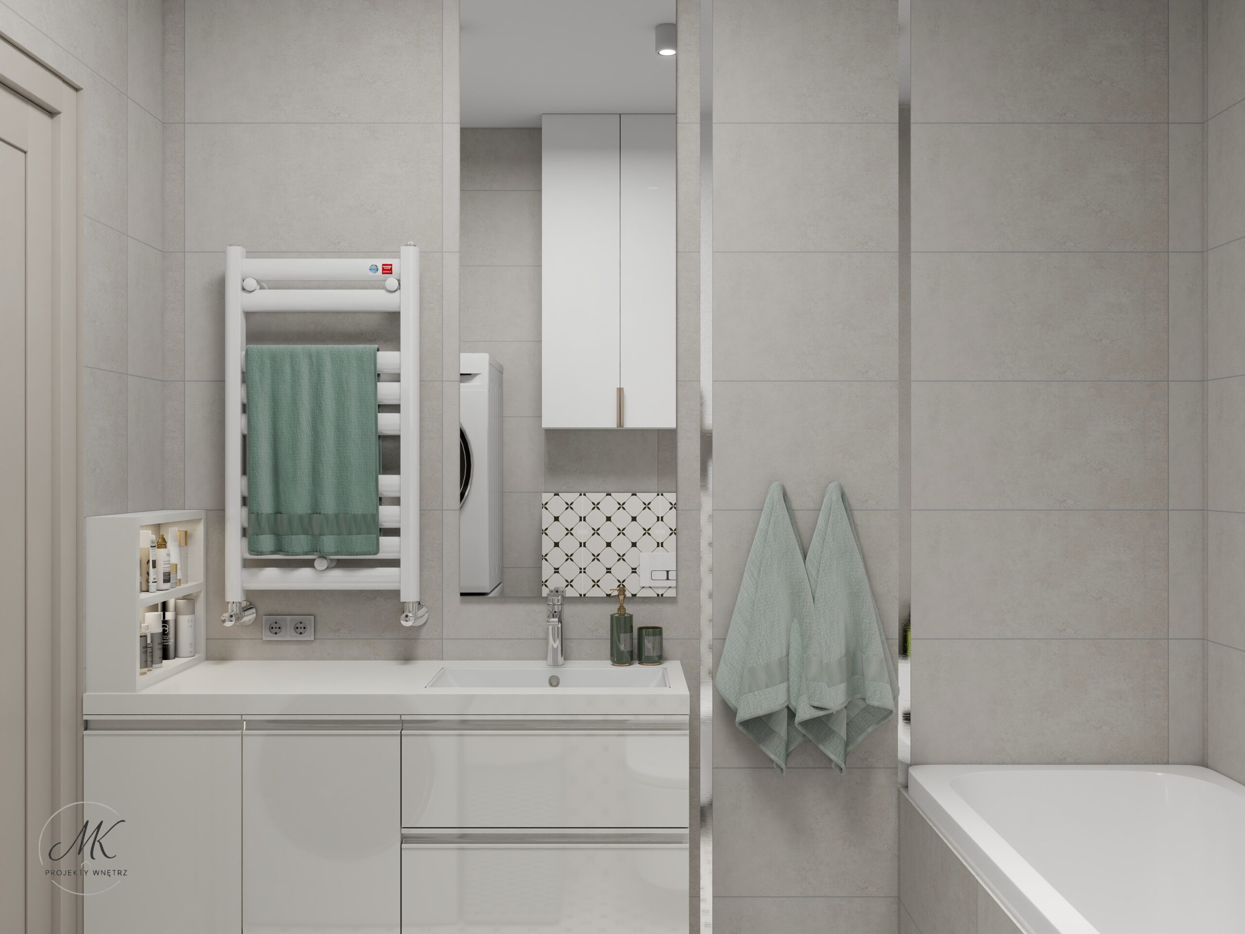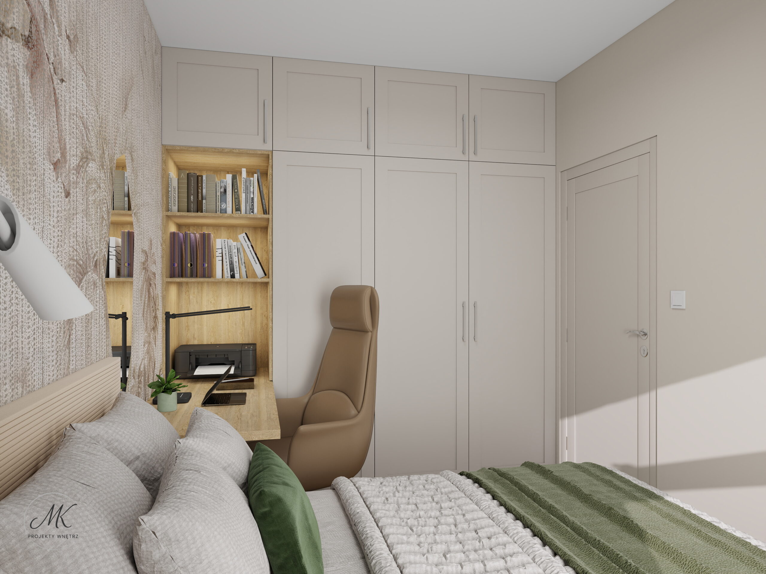 Jasna kolorystyka oparta na ciepłych beżach, delikatnych szarościach i naturalnym drewnie optycznie powiększa wnętrze, tworząc spójne i harmonijne tło. Subtelne detale, takie jak geometryczna mozaika w łazience, roślinna tapeta w sypialni czy granitowy blat w aneksie kuchennym, nadają wnętrzu charakter i indywidualny styl.