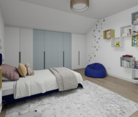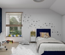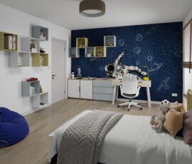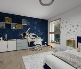Pokój małego odkrywcy kosmosu łączy zabawę, naukę i sen w jednej spójnej przestrzeni. Jasne barwy, granatowe akcenty i motyw kosmosu tworzą wnętrze pełne wyobraźni.