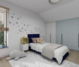 Pokój powstał z myślą o małym odkrywcy kosmosu – miejscu łączącym sen, naukę i zabawę. Jasne wnętrza z naturalnym drewnem uzupełniono głębokim granatem oraz subtelnymi akcentami w błękicie, musztardzie i szarości, tworząc przestrzeń pobudzającą wyobraźnię, a jednocześnie uporządkowaną.