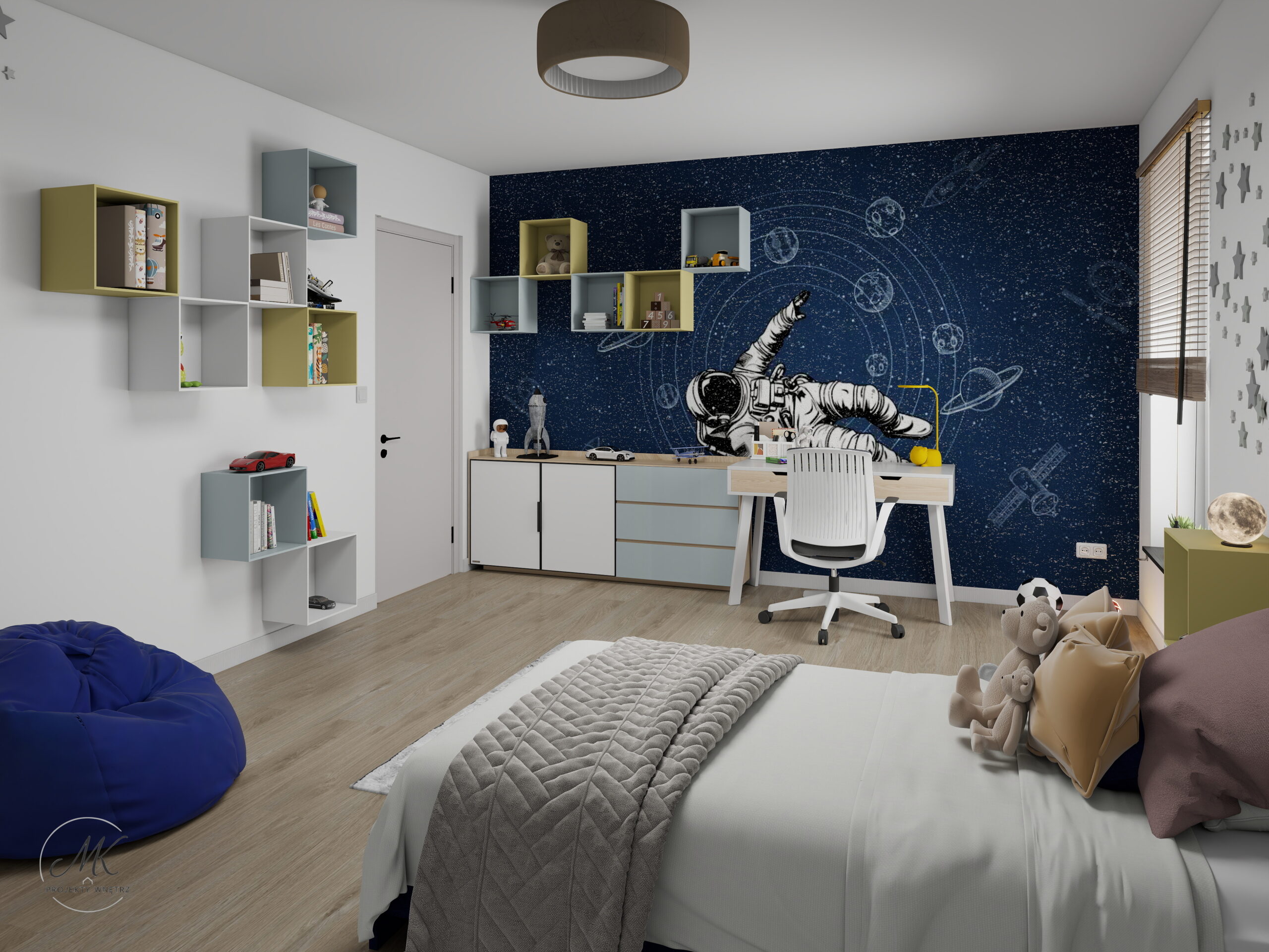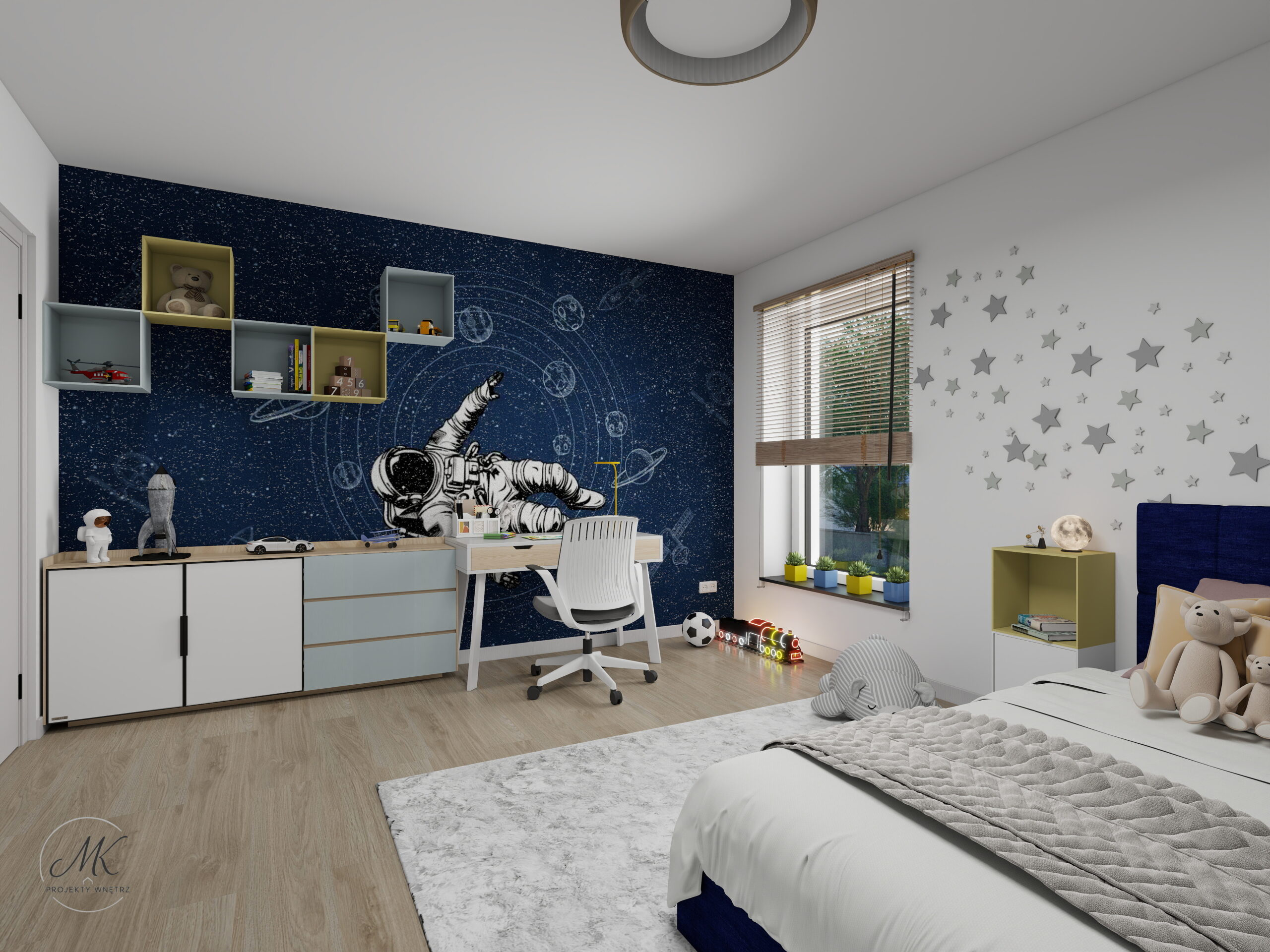 Pokój powstał z myślą o małym odkrywcy kosmosu – miejscu łączącym sen, naukę i zabawę. Jasne wnętrza z naturalnym drewnem uzupełniono głębokim granatem oraz subtelnymi akcentami w błękicie, musztardzie i szarości, tworząc przestrzeń pobudzającą wyobraźnię, a jednocześnie uporządkowaną.