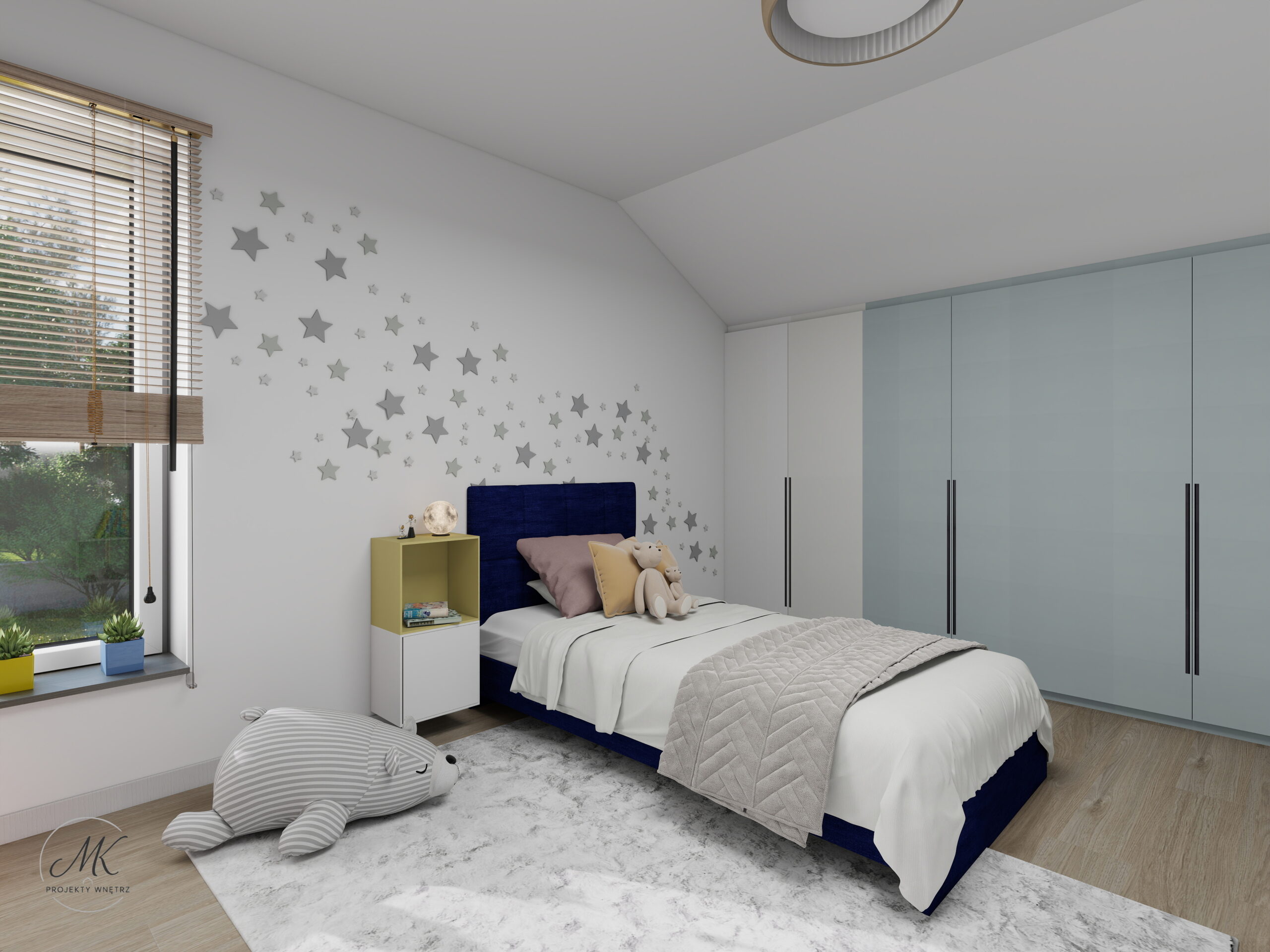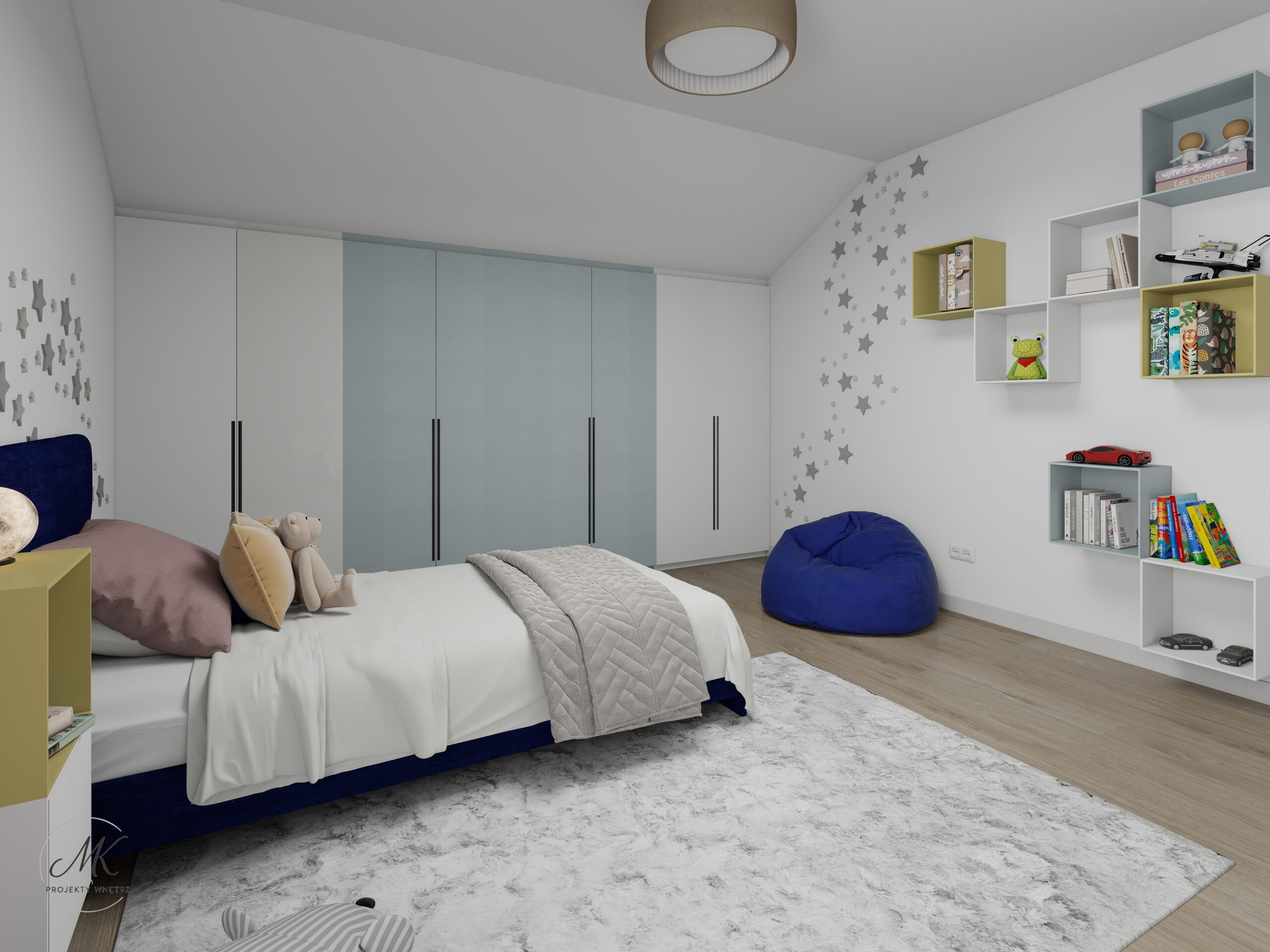 Pokój małego odkrywcy kosmosu łączy zabawę, naukę i sen w jednej spójnej przestrzeni. Jasne barwy, granatowe akcenty i motyw kosmosu tworzą wnętrze pełne wyobraźni.