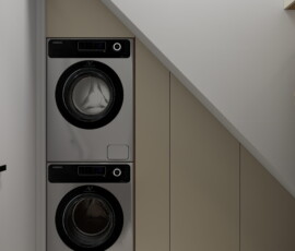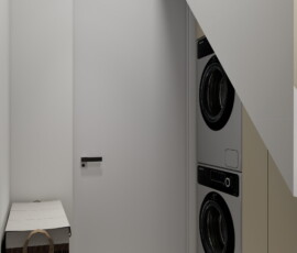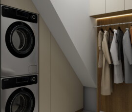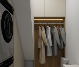 Nawet trudne zakątki mogą być funkcjonalne i przytulne. Pralka i suszarka w słupku, sprytna zabudowa dopasowana do skosu oraz praktyczne miejsce do przechowywania tworzą wygodną i uporządkowaną przestrzeń. Jasne kolory, ciepłe beże i naturalne drewno nadają wnętrzu spokojny charakter, a przemyślane rozwiązania funkcjonalne sprawiają, że nawet najmniejszy kącik staje się wygodny i estetyczny.