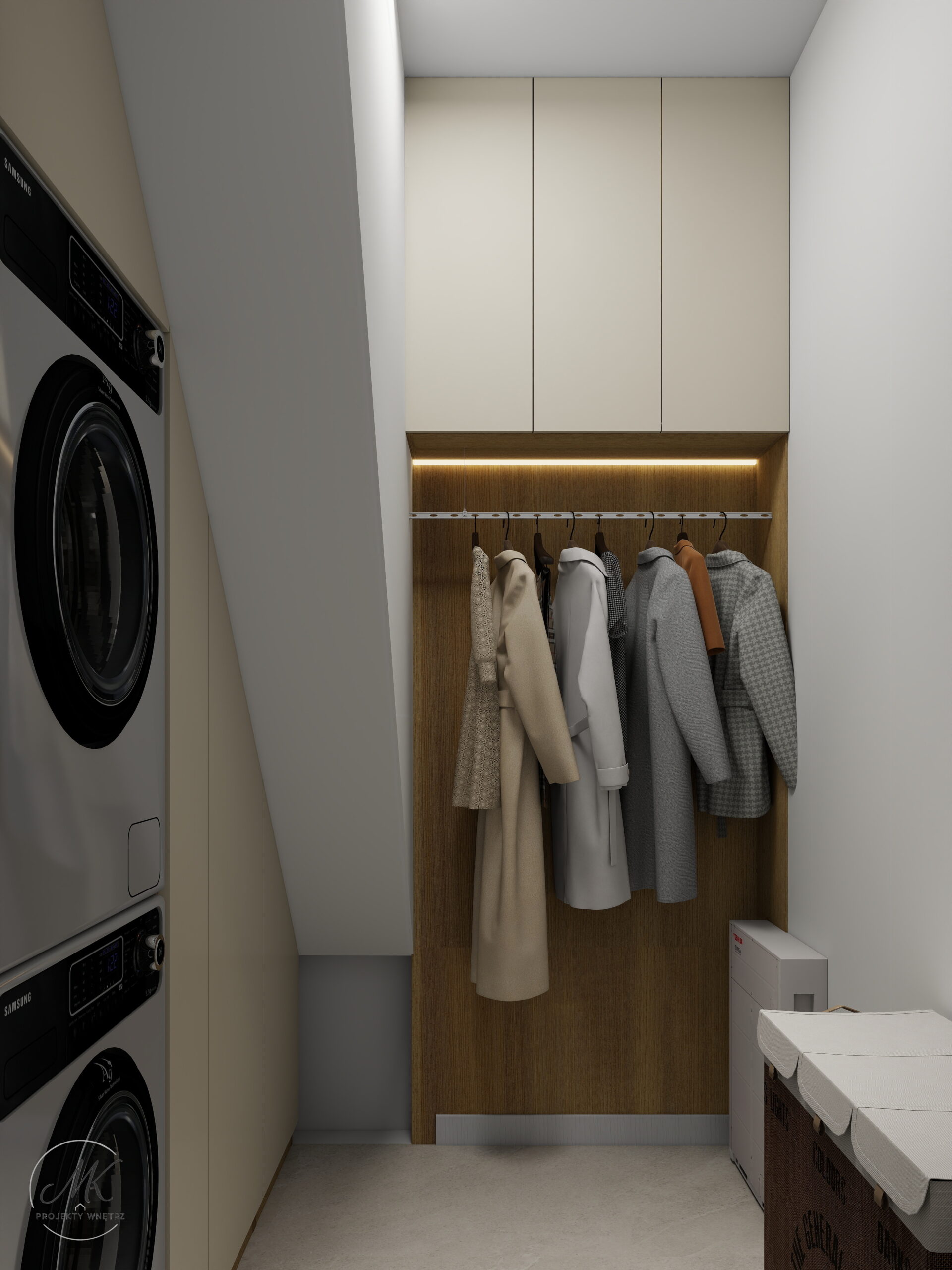 Nawet trudne zakątki mogą być funkcjonalne i przytulne. Pralka i suszarka w słupku, sprytna zabudowa dopasowana do skosu oraz praktyczne miejsce do przechowywania tworzą wygodną i uporządkowaną przestrzeń. Jasne kolory, ciepłe beże i naturalne drewno nadają wnętrzu spokojny charakter, a przemyślane rozwiązania funkcjonalne sprawiają, że nawet najmniejszy kącik staje się wygodny i estetyczny.