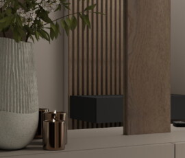 Duża, pojemna szafa zapewnia miejsce na okrycia i buty, a ukryte drzwi przesuwne prowadzące na klatkę schodową płynnie wkomponowano w aranżację, nie zaburzając spójności wnętrza. Lustro i delikatne oświetlenie optycznie powiększają przestrzeń, a pionowe lamele dodają elegancji i lekkości.