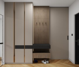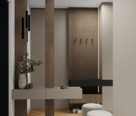 Niewielki wiatrołap, który łączy elegancję z funkcjonalnością, pokazuje jak efektywnie wykorzystać zaledwie 5 m². Ciepłe beże, naturalne drewno i nowoczesne detale tworzą przytulną i stylową przestrzeń.