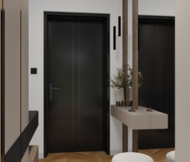 Ten niewielki wiatrołap to elegancka i funkcjonalna wizytówka domu, mimo niewielkiej przestrzeni. Jasne, ciepłe beże i naturalne drewno połączono z czarnymi akcentami, tworząc przytulną, nowoczesną przestrzeń, która już od progu wprowadza spokój i harmonię.