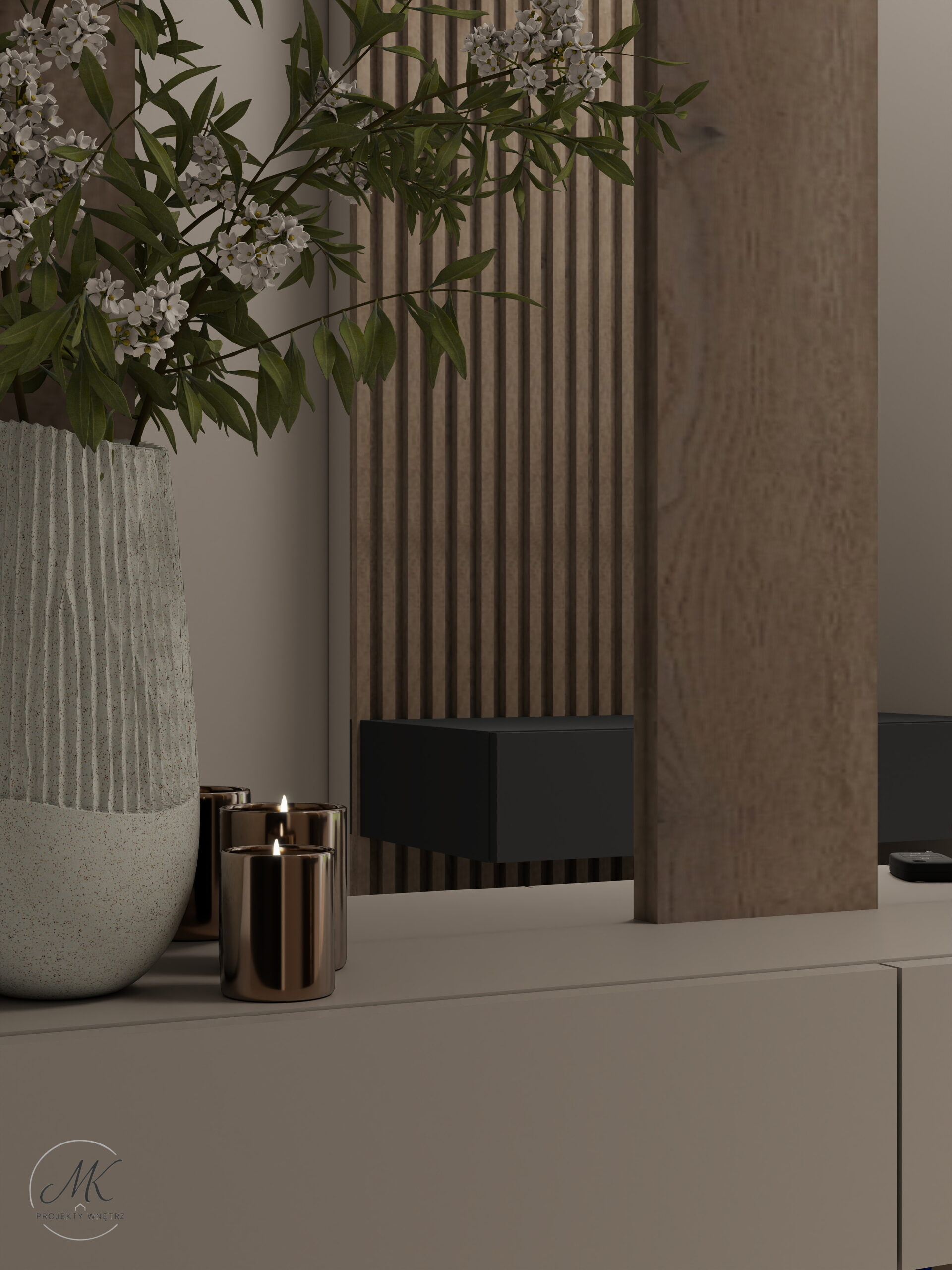Ten niewielki wiatrołap to elegancka i funkcjonalna wizytówka domu, mimo niewielkiej przestrzeni. Jasne, ciepłe beże i naturalne drewno połączono z czarnymi akcentami, tworząc przytulną, nowoczesną przestrzeń, która już od progu wprowadza spokój i harmonię.