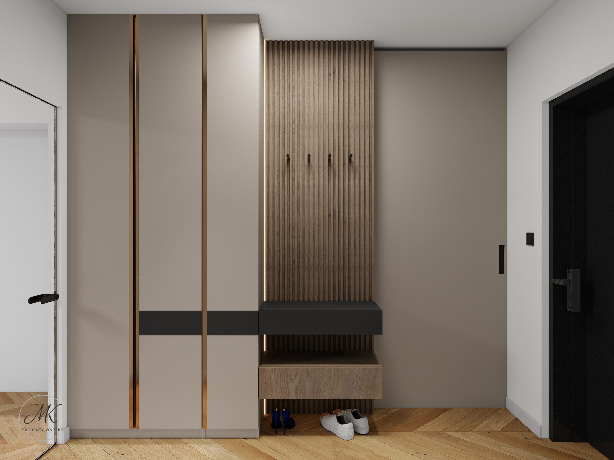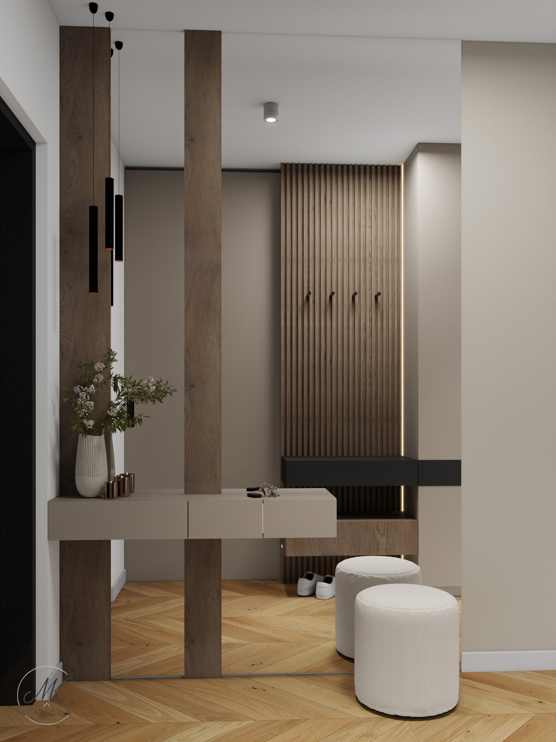 Niewielki wiatrołap, który łączy elegancję z funkcjonalnością, pokazuje jak efektywnie wykorzystać zaledwie 5 m². Ciepłe beże, naturalne drewno i nowoczesne detale tworzą przytulną i stylową przestrzeń.